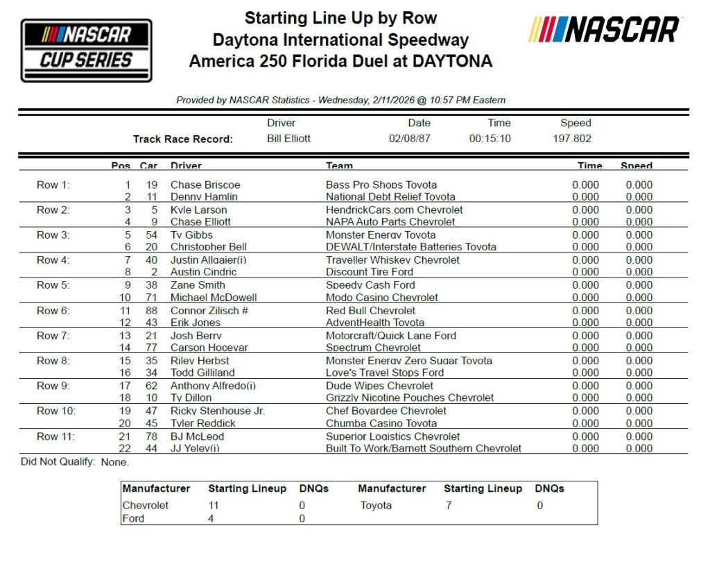 The NASCAR Cup Series will now take to the track on Thursday night for the America 250 Florida Duel at Daytona. The two races will set the remaining positions for the Daytona 500 on Sunday. Live coverage of the Duels will broadcast on FS1 at 7 p.m. ET.