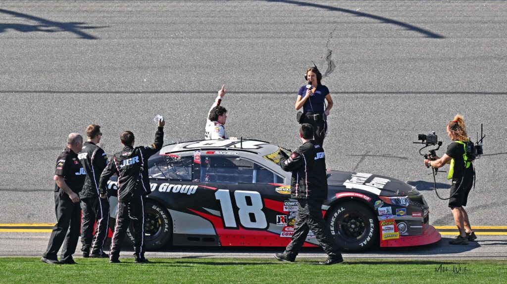 Ruggiero had command of the race on the final lap. As he entered the backstretch as the leader, Tim Richmond spun, but the race stayed green. Entering the tri-oval for the final time, Daniel Dye stayed behind Ruggiero, and Jake Bolloman attempted to lead a line on the high side but didn’t have the speed. Gio took the checkered flag, marking the first for him and the first for Joe Gibbs Racing in the series at Daytona.